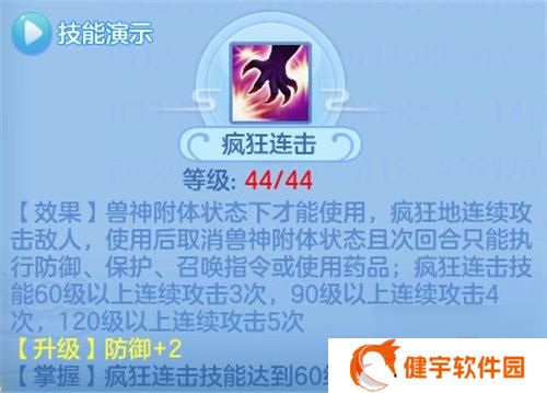 疯狂连击:疯狂的连续攻击敌人,单体点杀技能,使用后取消兽神附体状态且次回合休息。