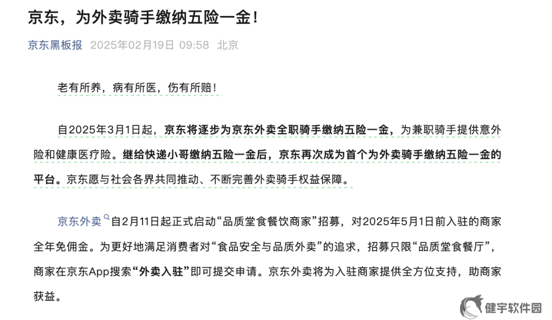 值得注意的是,京东早在2月19日就透露了这一计划,宣布自2025年3月1日起,将逐步为全职外卖骑手缴纳五险一金,并为兼职骑手提供意外险和健康医疗险。这一举措在京东外卖正式启动“品质堂食餐饮商家”招募活动后不久便得以公布,商家在2025年5月1日前入驻京东外卖可享全年免佣金的优惠。