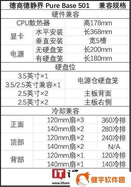Pure Base 501系列机箱的尺寸为宽231mm、深450mm、高449mm,体积为46.67升,支持ATX及以下规格的主板。该系列机箱还拥有7条PCIe扩展槽,并支持显卡竖装。其兼容规格广泛,能够满足不同用户的需求。