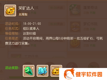 两界山(5级):可采集孔雀石、虫胶、硝石、金等产品。大师玩家只有在活动期间才可以在此采矿。