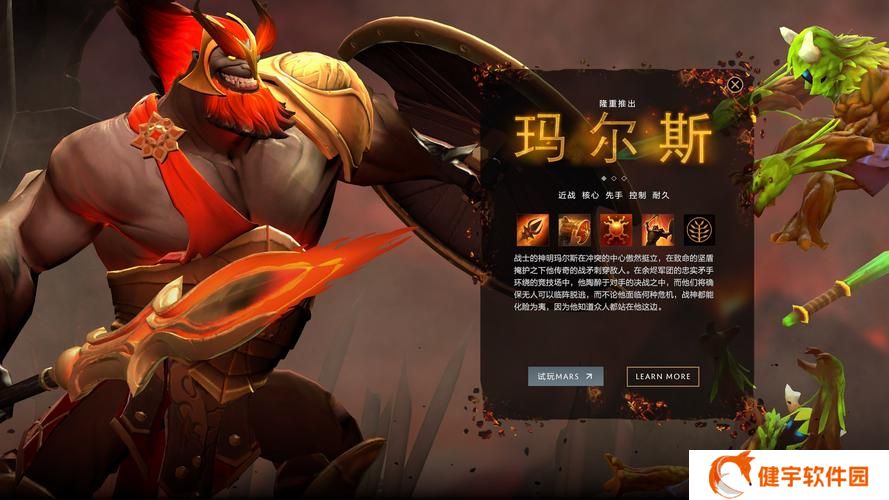 马尔斯是一个肉盾和控制型英雄,可以利用“战神迅矛”将敌人击退至友军范围进行击杀。